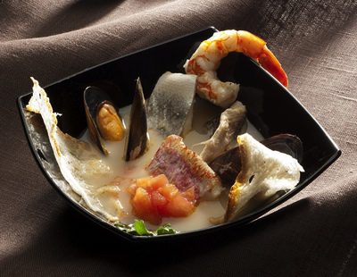 Al haber cortado el bacalao en lomos ya está listo para emplatar. Decidimos si colocar uno o dos lomos por comensal, en función de cómo sea el resto del menú, y los ponemos sobre el plato y napamos con un poco del jugo de la sidra. Coronamos con gambas y almejas y llevamos a la mesa para disfrutar en la mesa.