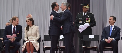 François Hollande saluda al Rey Felipe junto a los Duques de Cambridge en el centenario del estallido de la I Guerra MundialTodo ocurrió el lunes por la mañana en Lieja. Los Reyes de Bélgica recibieron a los Duques de Cambridge primero y al Rey Felipe después. El Príncipe Guillermo y Kate Middleton tomaron asiento en la tribuna principal para seguir el desfile preparado y se sentaron junto al presidente de Francia, François Hollande, con el que charlaron animadamente.